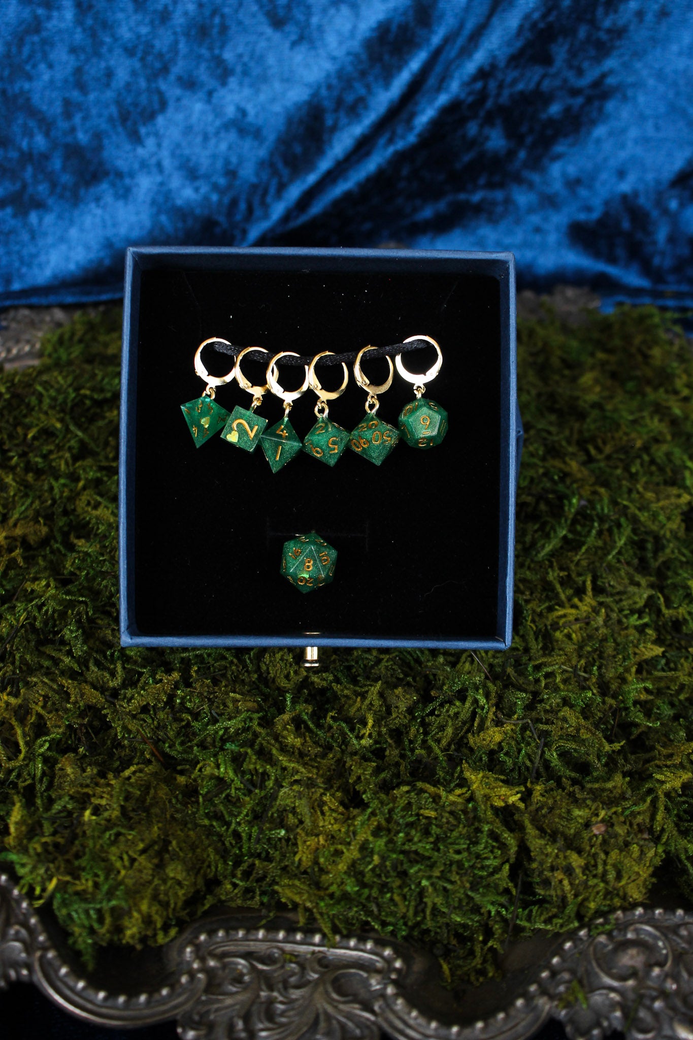 The set is made up of seven polyhedral dice safety pin clip stitch markers. It includes:
