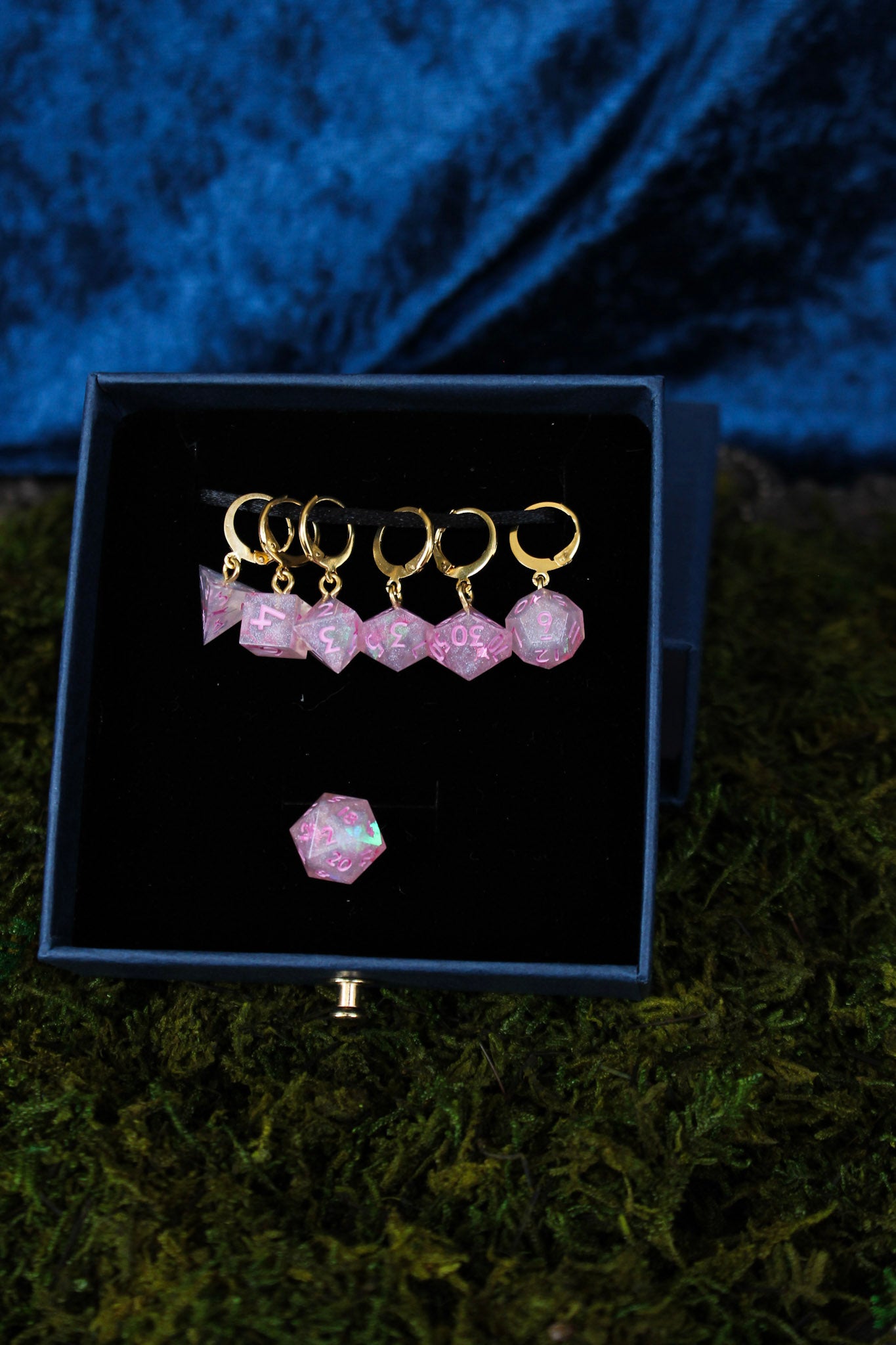 I hand pour each set in epoxy resin using a pressure pot and carefully setting the loop in before it cures for maximum stay power - meaning these are not roll-able dice.