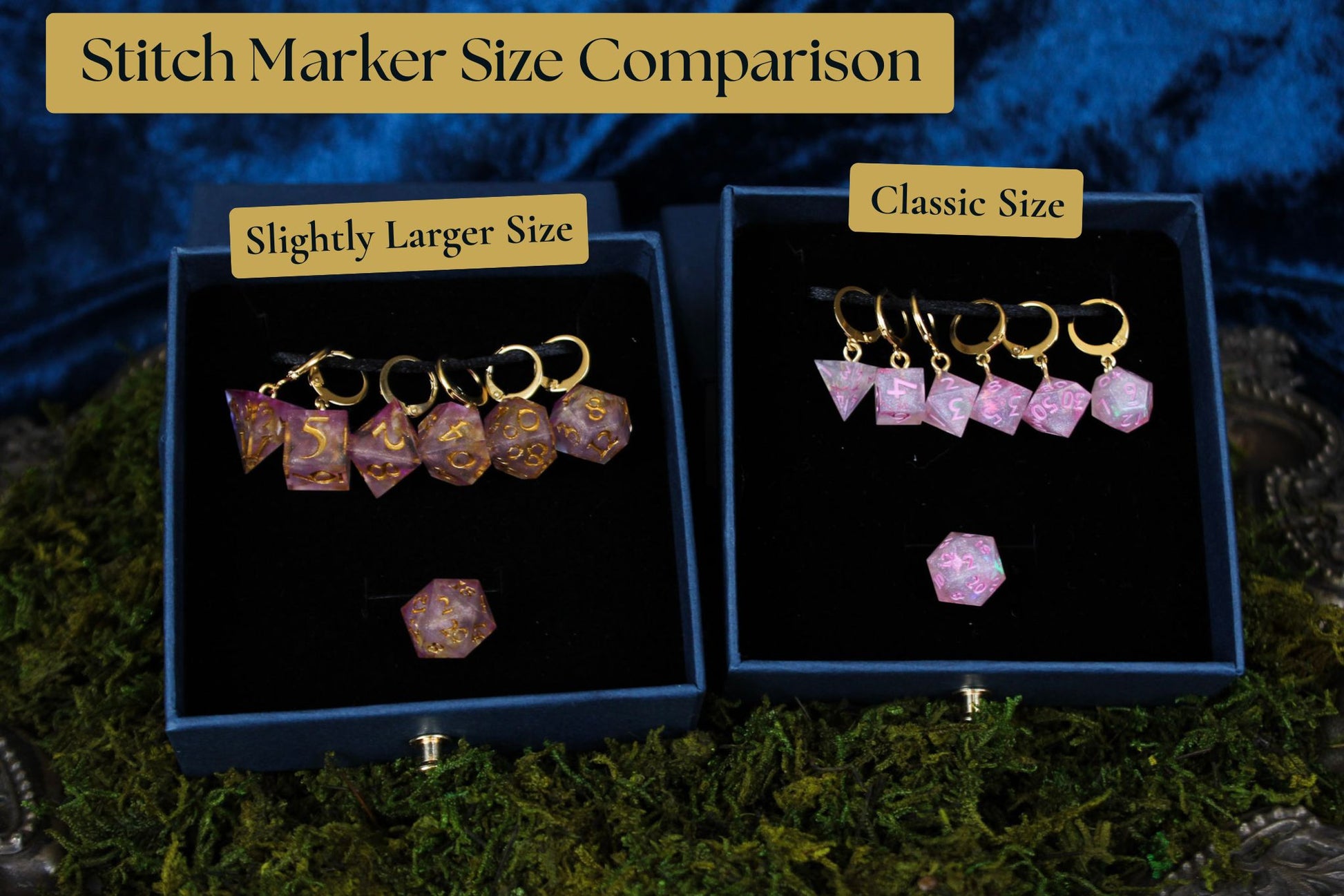 The set is made up of seven polyhedral dice safety pin clip stitch markers. It includes:
